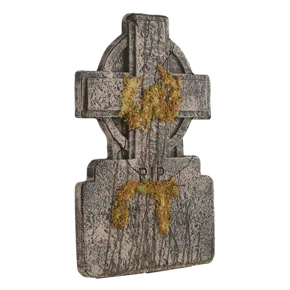 Set up a custom graveyard scene for Halloween with this RIP cross tombstone sculpture. The painted details and realistic form eerily depict the coldness and scary atmosphere of an abandoned graveyard. Made of Styrofoam, this grave marker endures outdoor exposure, and the built-in stakes allow quick and stable setup. With a distressed gray finish, this headstone looks aged and worn-out, enhancing a spooky and ghostly vibe. Use this 2-ft. RIP cross tombstone sculpture as a standalone decor or an accent piece to complete a faux cemetery Halloween display.