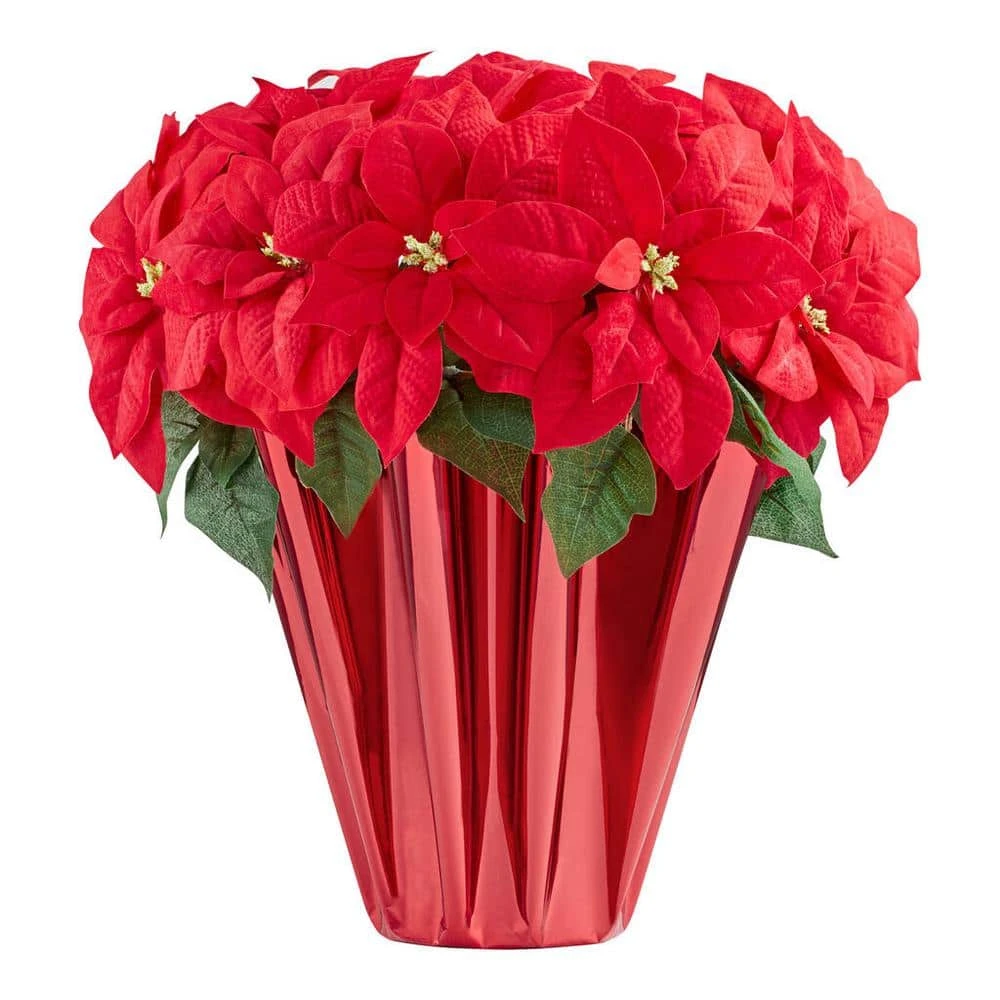 Perk up your holiday decor with this artificial poinsettia floral arrangement. The generous size stands out as a centerpiece or accents your table decor. Eleven polyester silk blooms create a full, realistic appearance for a lively look without the need for water or sun, while the foil-wrapped base offers effortless indoor placement on a desk, shelf or table. Featuring vibrant red hues, this artificial poinsettia floral arrangement helps make your yuletide merry and bright.