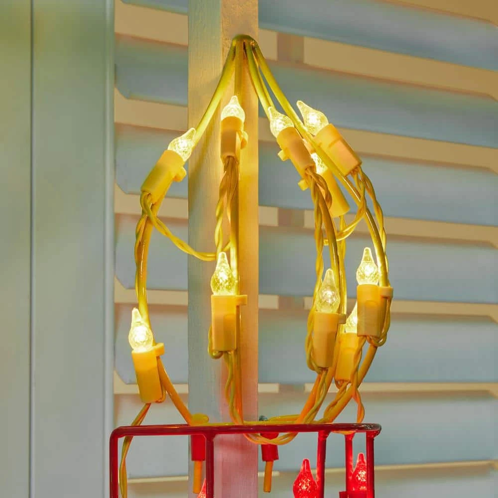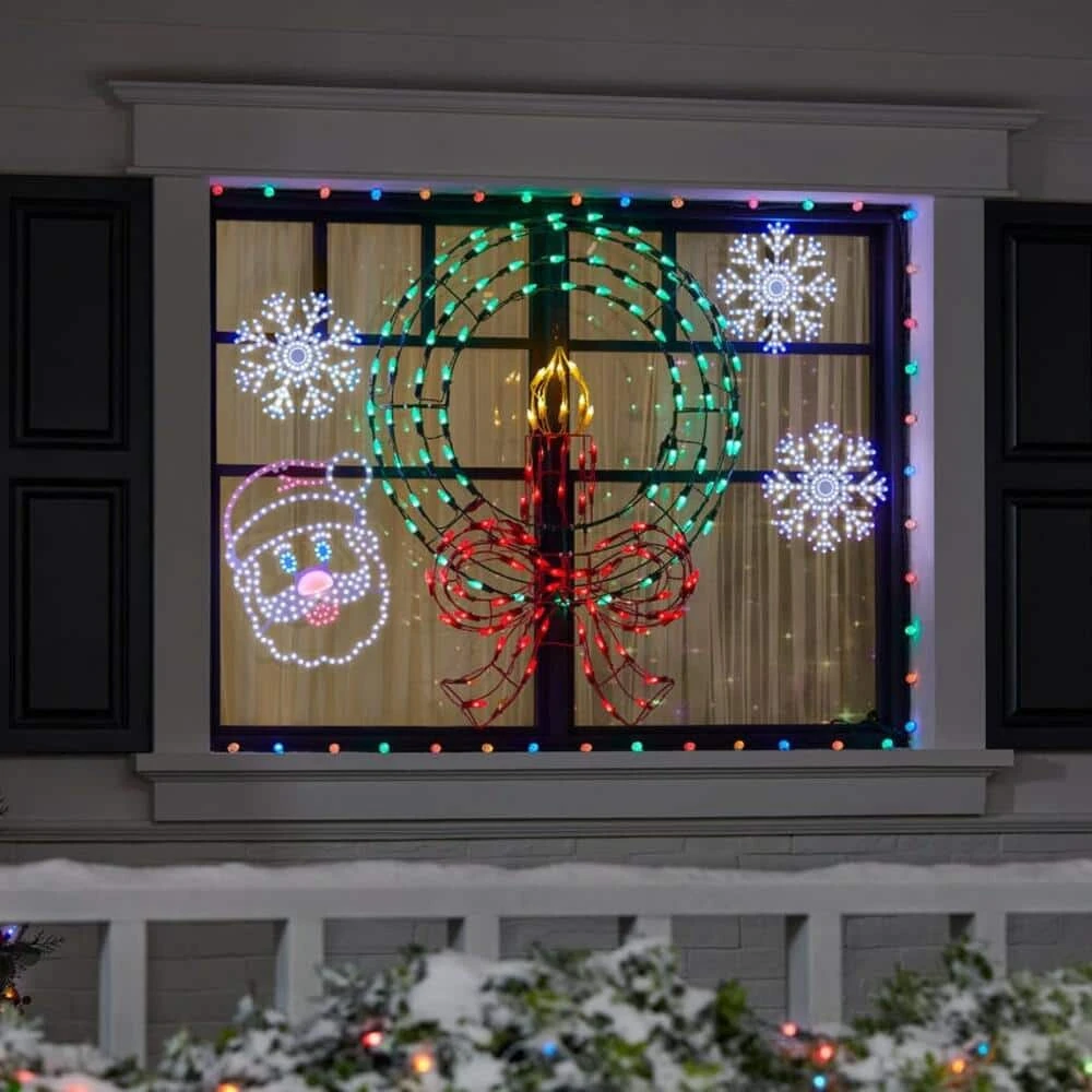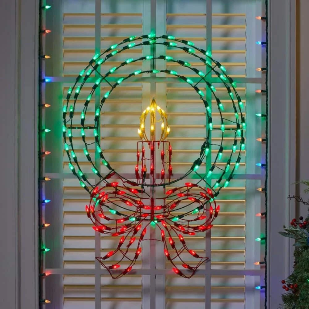 Make your home a holiday wonderland with this light-up Christmas wreath yard sculpture. This wintry wreath features a bow and candle for plenty of seasonal joy. The plug-in design keeps your display illuminated from night to night, while the multicolor faceted C5 LEDs twinkle and sparkle, casting a lively glow upon your lawn. With a powder-coated steel frame, this light-up Christmas wreath yard sculpture adorns your abode with yuletide cheer for seasons to come.