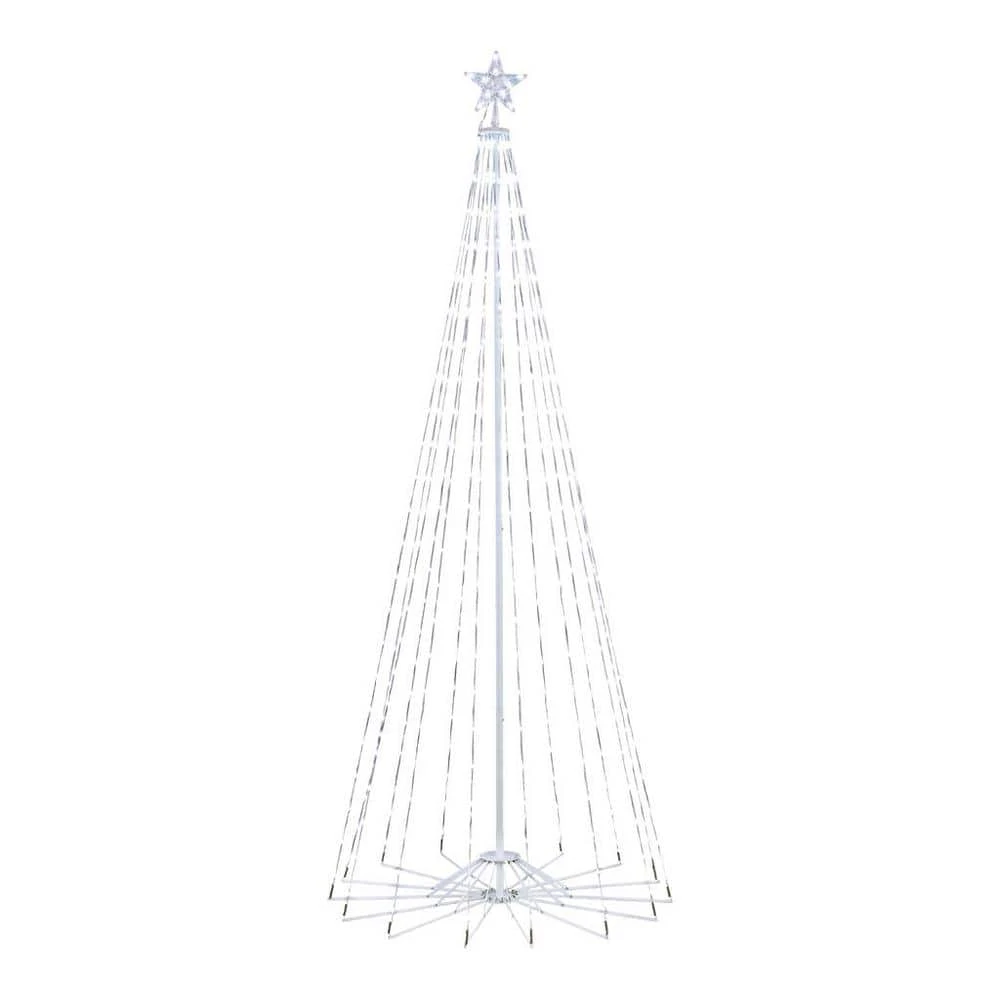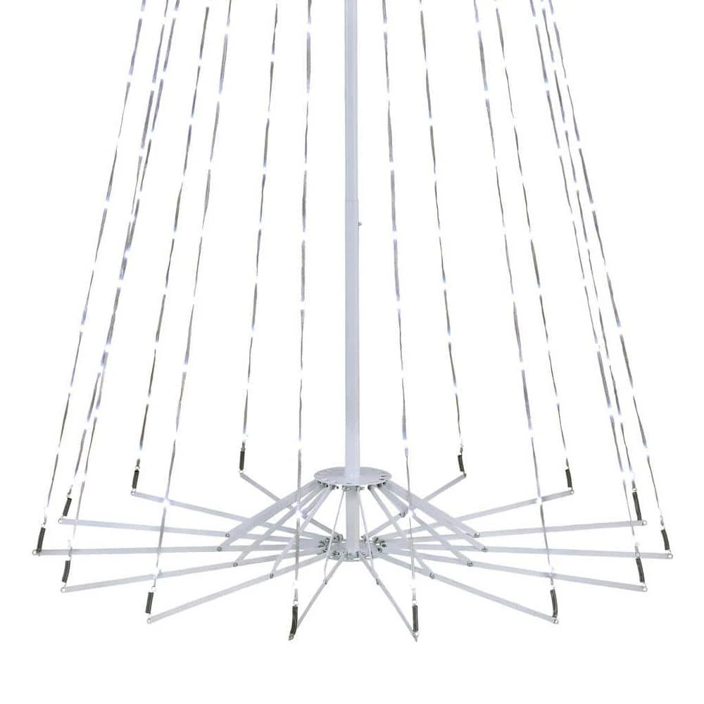 Set your yard apart from the neighbors with this spectacular 8 ft. Collapsible Lighted Cone Tree. 355 RGB muti-function lights creates your own outdoor light show. White metal frame with collapsible base and telescopic pole for easy assembly and storage after using. The cone tree includes a 10 light star that is synchronized with the other tree lights.